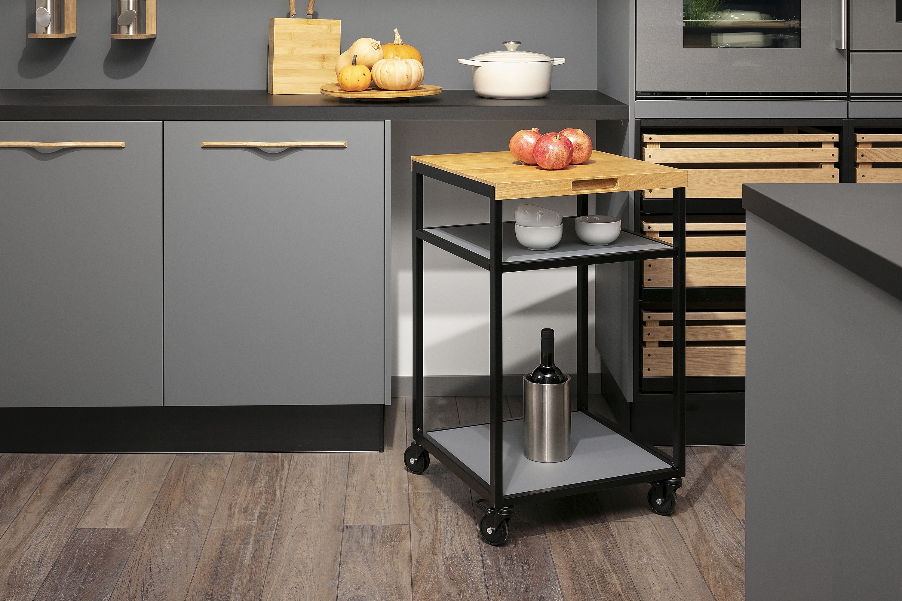 Schon gemerkt? Die einstigen Teewagen sind längst zurück – und das in den unterschiedlichsten Ausführungen: ganz offen oder mit Schubladen und Schranktüren. Ideal ist es, wenn so ein Servierwagen sein eigenes „Carport“ unter der Arbeitsplatte bekommt, denn dann kann man ihn schnell hervorholen und genauso schnell wieder aus dem Weg rollen.