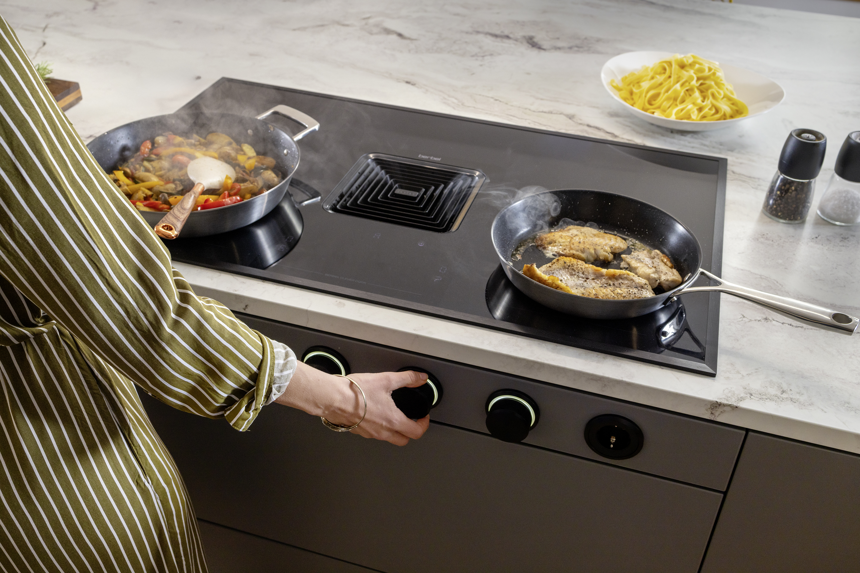 Mit einer Breite von 90 cm und großzügig gestalteten Kochzonen bietet die Infinity Pro maximale Freiheit beim Kochen (Infinity Space) und lässt sich flexibel in unterschiedliche Küchendesigns integrieren. Die Steuerung erfolgt über eine Quad-Slider-Bedienung mit Touch-Funktion und kann optional durch elegante Drehknebel ergänzt werden (Premium Control). Zusätzlich stehen smarte Clever Cook-Programme zur Verfügung, die automatisch optimale Einstellungen für verschiedene Kochprozesse wie Braten, Pasta oder Warmhalten wählen. Praktische Details wie das Compact Clean-System, das die Abscheideeinheit leicht entnehmen und spülmaschinengeeignet reinigen lässt, erhöhen den Bedienkomfort. Wahlweise kann die Downline Infinity Pro im Abluft- oder Umluftbetrieb betrieben werden, auch mit wartungsfreiem permalyt®-Filter.